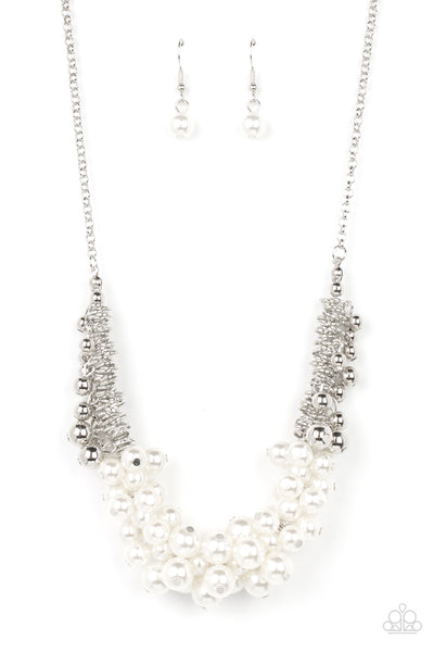 A bubbly cluster of white pearls are bunched together between hanging silver beads that dangle between jampacked rows of silver rings, resulting in exaggerated effervescence below the collar. Features an adjustable clasp closure.
