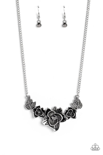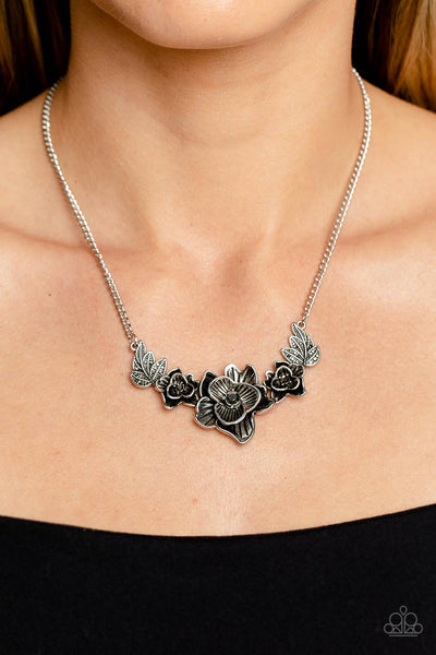 Dainty hematite rhinestones are sprinkled across leafy silver frames that branch out from a trio of mismatched silver floral frames dotted in dainty silver studs and hematite rhinestones, resulting in a beautiful botanical centerpiece below the collar. Features an adjustable clasp closure.