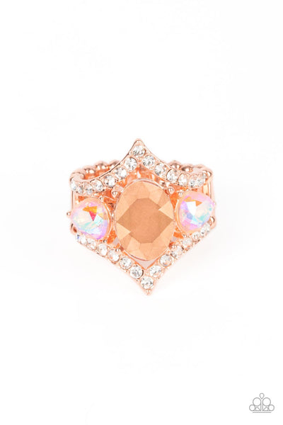 An oversized coppery aurum oval gem is flanked by a pair of iridescent teardrop rhinestones atop a white rhinestone dotted frame, resulting in a dramatic dazzle atop the finger. Features a stretchy band for a flexible fit.
