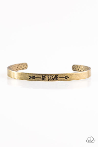 Brushed in a glistening finish, a dainty brass cuff is stamped in a tribal arrow pattern and the phrase “Be Brave” for a motivational finish.