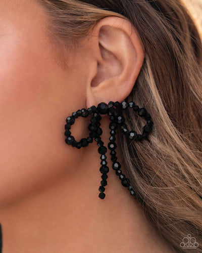 Infused along an invisible wire, faceted black high-sheen beads curl and loop into a stunning bow, creating a classy statement at the ear. Earring attaches to a standard post fitting.