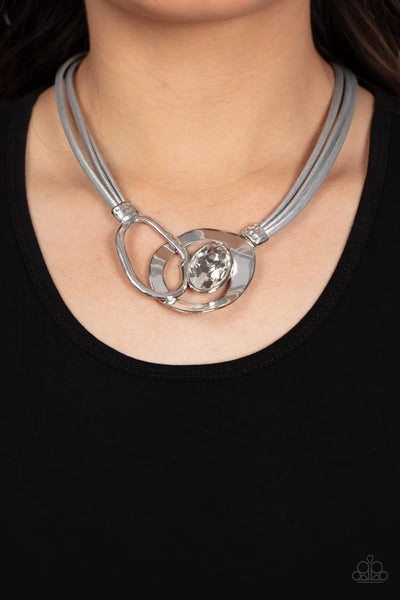 Attached to shimmery strands of pink leather, a pair of oversized and warped silver links delicately overlaps into a contemporary centerpiece below the collar. An exaggerated white gem asymmetrically embellishes the silvery accent piece, adding unexpected elegance to the modern design. Features an adjustable clasp closure.