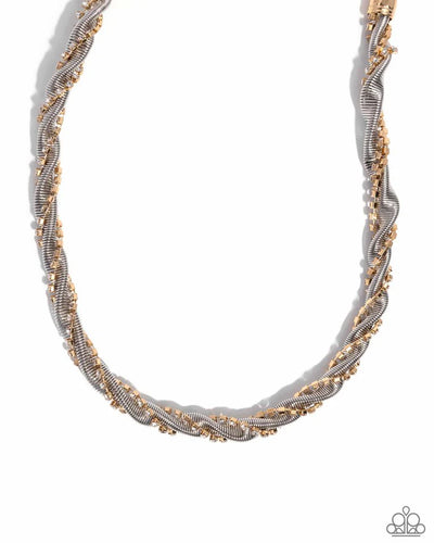 A silver snake chain and a white rhinestone-encrusted dainty old box chain twists and coils along the neckline, layering into a sassy display of sparkle. Features an adjustable clasp closure.