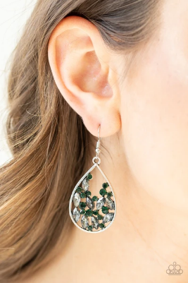 Classic green and smoky marquise-cut rhinestones collect inside of an airy silver frame, coalescing into a sparkling teardrop. Earring attaches to a standard fishhook fitting.