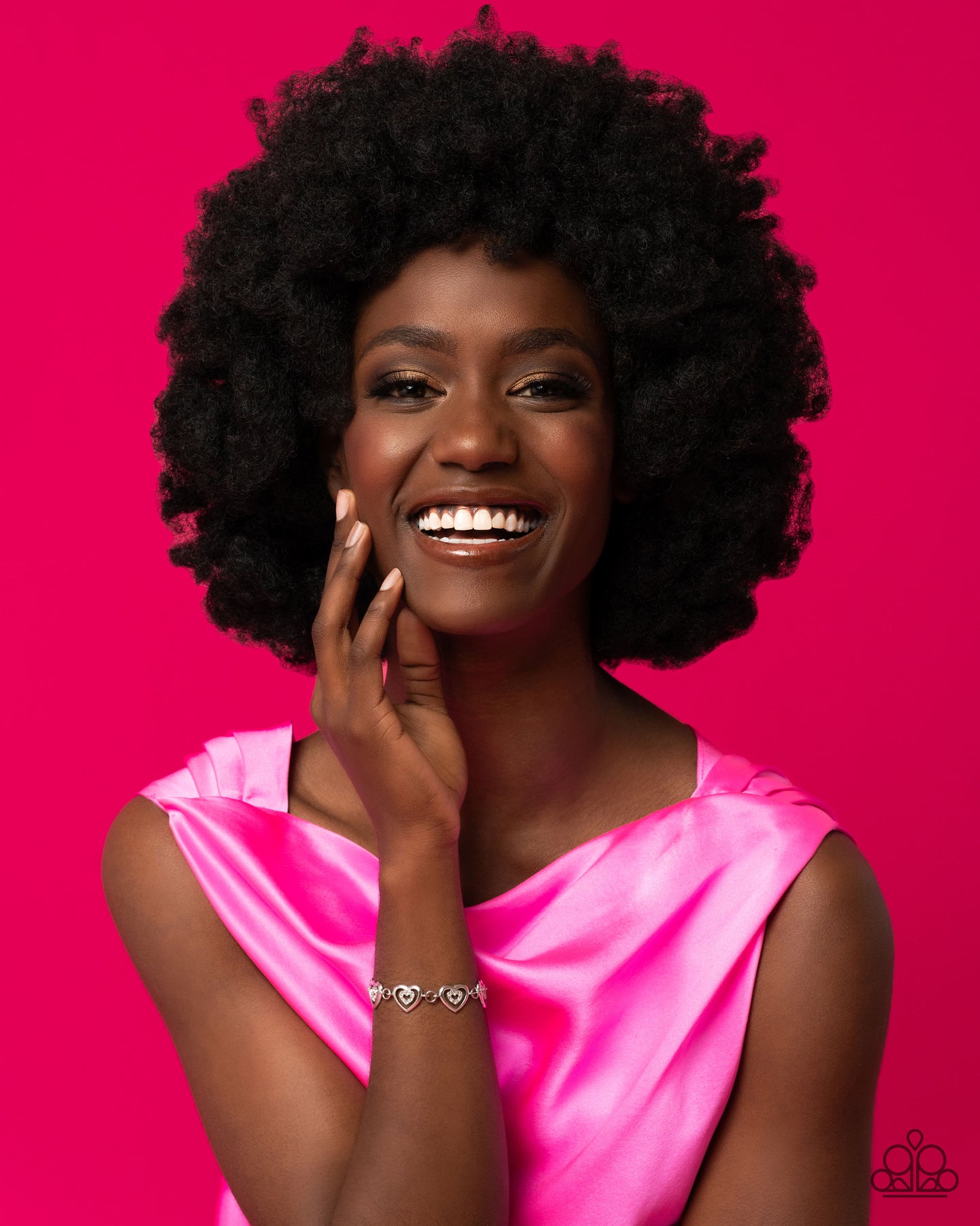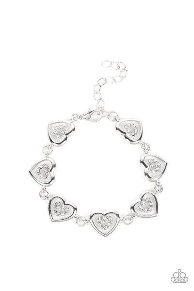Dotted with dainty white rhinestones, airy silver heart silhouettes are affixed to the points of larger silver heart frames. The two dimensional heart frames link together around the wrist in a flirtatious finish. Features an adjustable clasp closure.