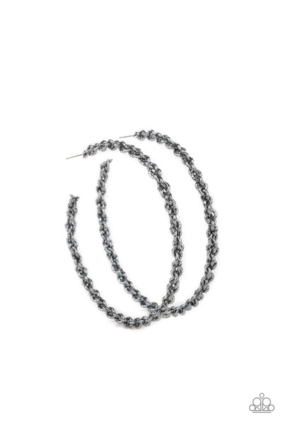 Brushed in a high-sheen shimmer, glistening gunmetal chain twists into an edgy hoop. Earring attaches to a standard post fitting. Hoop measures approximately 2 3/4" in diameter.