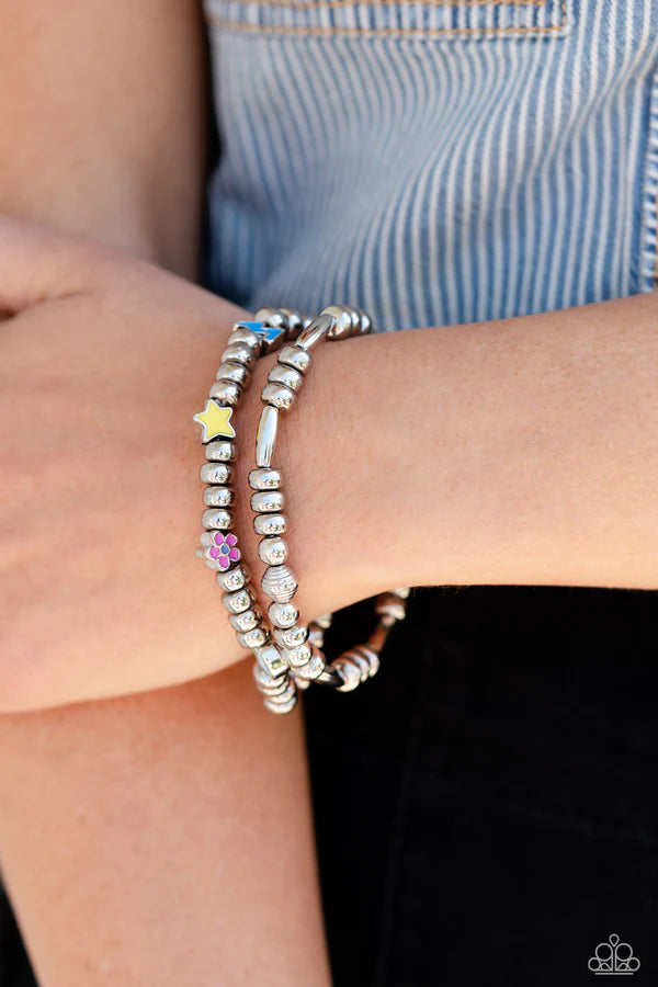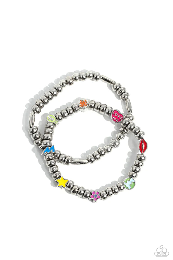 A strand of textured, cylindrical, and round high-sheen silver beads combine with a single strand of silver beads, sporadically infused with vivacious charm beads to create an energetic stack of stretchy bracelets. The colorful beaded stack features a yellow star, blue lightning bolt, green money bag, orange tropical flower, red lips, blue and green earth, pink and purple flower, and a pink heart charm with the words "love me" for a youthful finish.