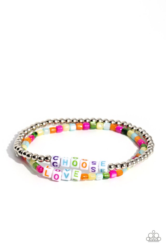 Infused with white cubed beads featuring purple, light blue, Classic Green, orange, and hot pink letters, a mismatched collection of silver and glassy multicolored beads are threaded along stretchy bands. Each multicolored letter on both stacks spells out the words "CHOOSE" and "LOVE", creating two inspirational layers around the wrist.