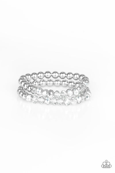 Dipped in a metallic shimmer, a collection of glittery crystal-like beads and shiny silver beads are threaded along two stretchy bands around the wrist for a refined look.