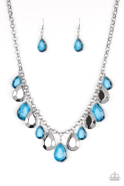 A collection of glassy blue and faceted silver teardrops drip below the collar, creating a vivacious fringe. Features an adjustable clasp closure.
