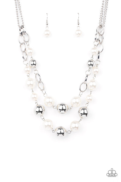 Sections of oversized silver chains, white pearls, and shiny silver beads haphazardly link into two timeless layers below the collar, creating a dramatically refined display. Features an adjustable clasp closure.