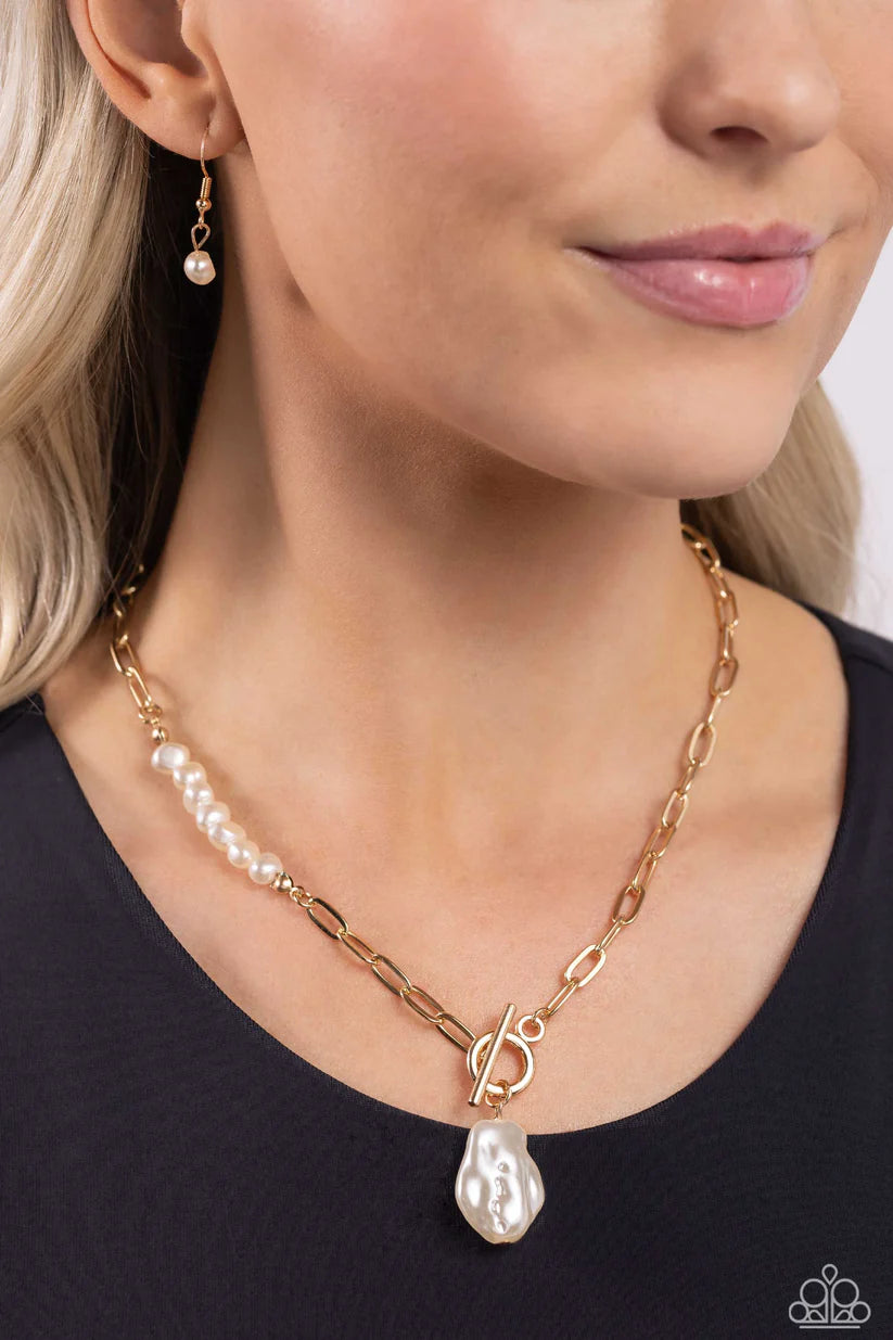Featuring an elegant lariat closure, an oversized, baroque white pearl cascades from the bottom of a gold paperclip chain for a refined fashion. Dainty, glossy baroque pearl beads are infused along one side of the gold chain for an additional touch of abstract sheen to the charming design.