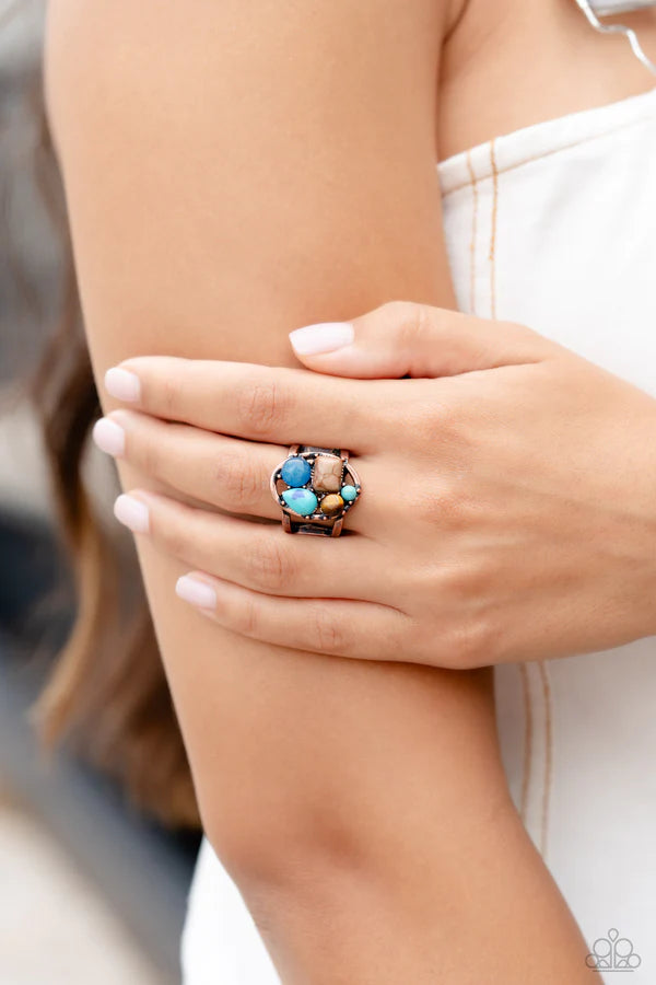 An earthy collection of tiger's eye, turquoise, marbled brown, and various blue stones are pressed into the center of an airy copper oval, for an earthy centerpiece. The oval display rests atop airy copper bands, further highlighting the earthy textures and sheens of the various stones. Features a stretchy band for a flexible fit. As the stone elements in this piece are natural, some color variation is normal.