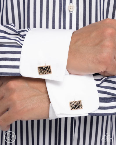 Featuring a black-painted backdrop, a gold rectangular frame is embossed in a slanted plaid-like pattern, creating a tactile timeless cuff link.