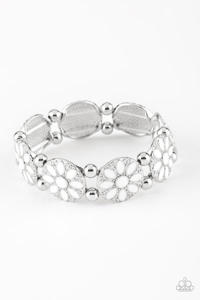 Painted in a refreshing white finish, ornate silver floral frames are threaded along a stretchy band across the wrist for a seasonal look.