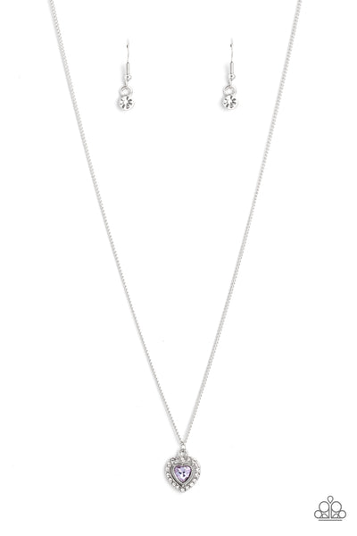 Dainty, glittery white rhinestones encircle a pronged, purple heart shaped gem, creating a flirty and dainty pendant below the collar. Features an adjustable clasp closure.