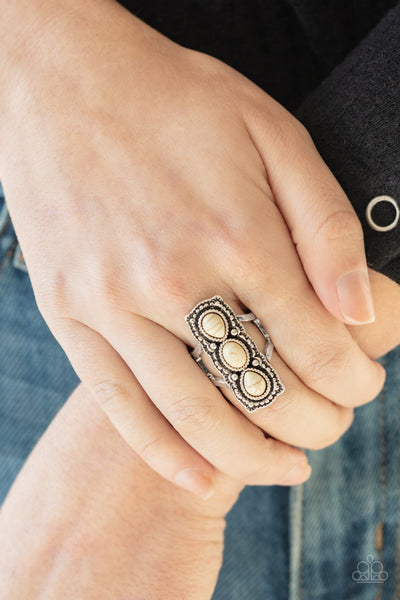 Teardrop and oval white stones are pressed into the center of a studded silver frame, creating a bold rectangular centerpiece down the finger. Features a stretchy band for a flexible fit.
