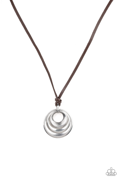 Textured and smooth beveled brass rings are knotted in place at the bottom of a brown leather cord, creating a rustic pendant. Features an adjustable sliding knot closure.