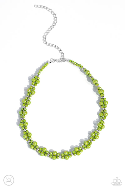Dipped in an iridescent finish, varying sizes of green pearls cluster around the neckline in a dreamy pop of color. Dainty silver beads alternate along the collar and pearly clusters for a touch of industrial shimmer. Features an adjustable clasp closure. Due to its prismatic palette, color may vary.