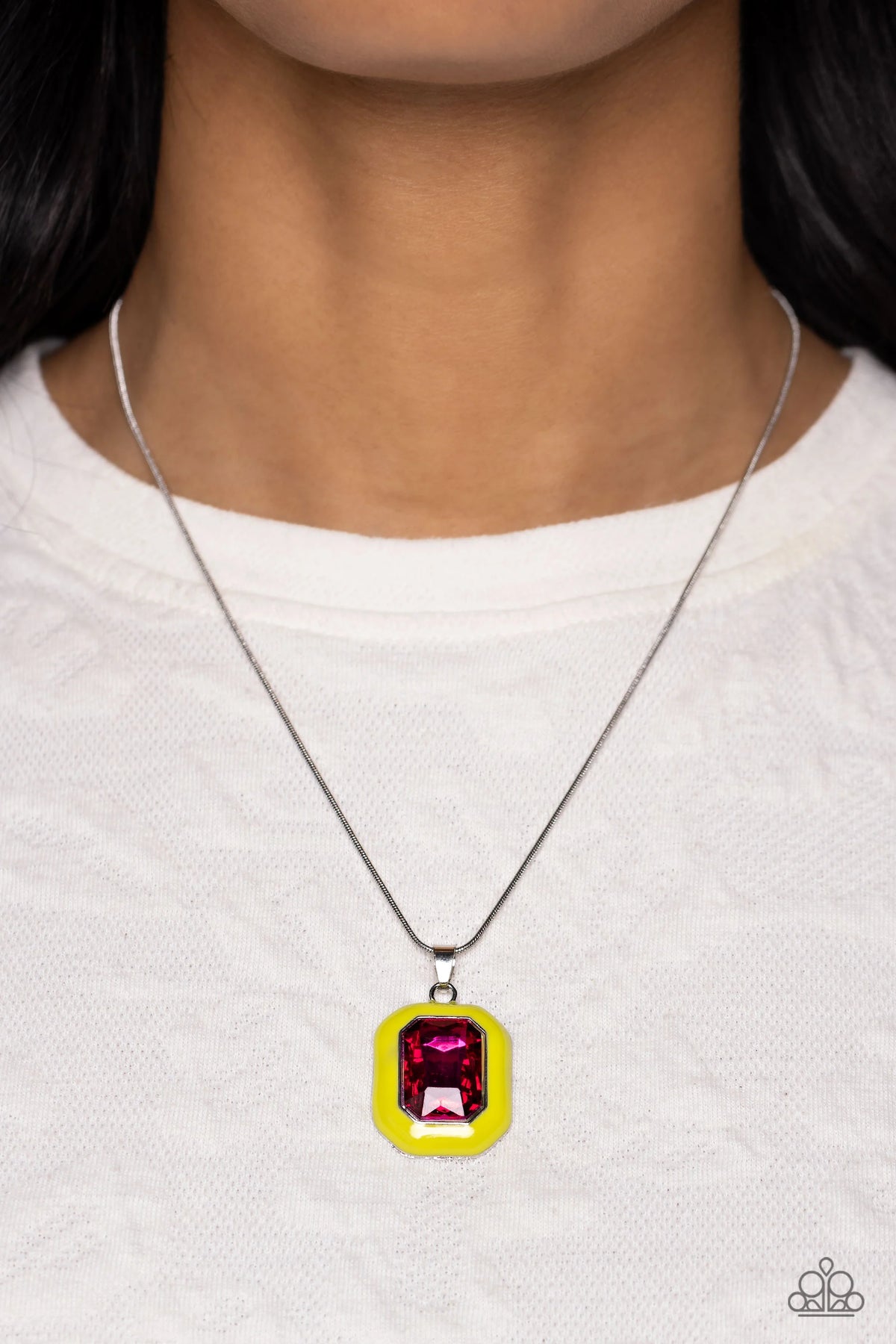 An oversized, fuchsia emerald-cut gem is bordered by a frame of neon Love Bird, creating a bright pendant that swings from the bottom of a silver snake chain. Features an adjustable clasp closure.