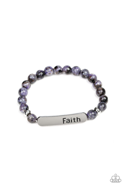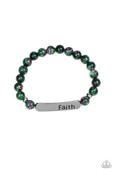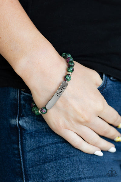 A collection of green stones, dainty silver beads, and a silver plate stamped with the inspirational word, "faith", are threaded along a stretchy band around the wrist for a seasonal look.