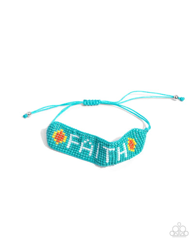 Resembling a handwoven pattern, white seed beads spell out the word "Faith" atop a tiffany, yellow, and orange seed bead-embellished bracelet for an iconic, inspirational look. Features an adjustable sliding knot closure.