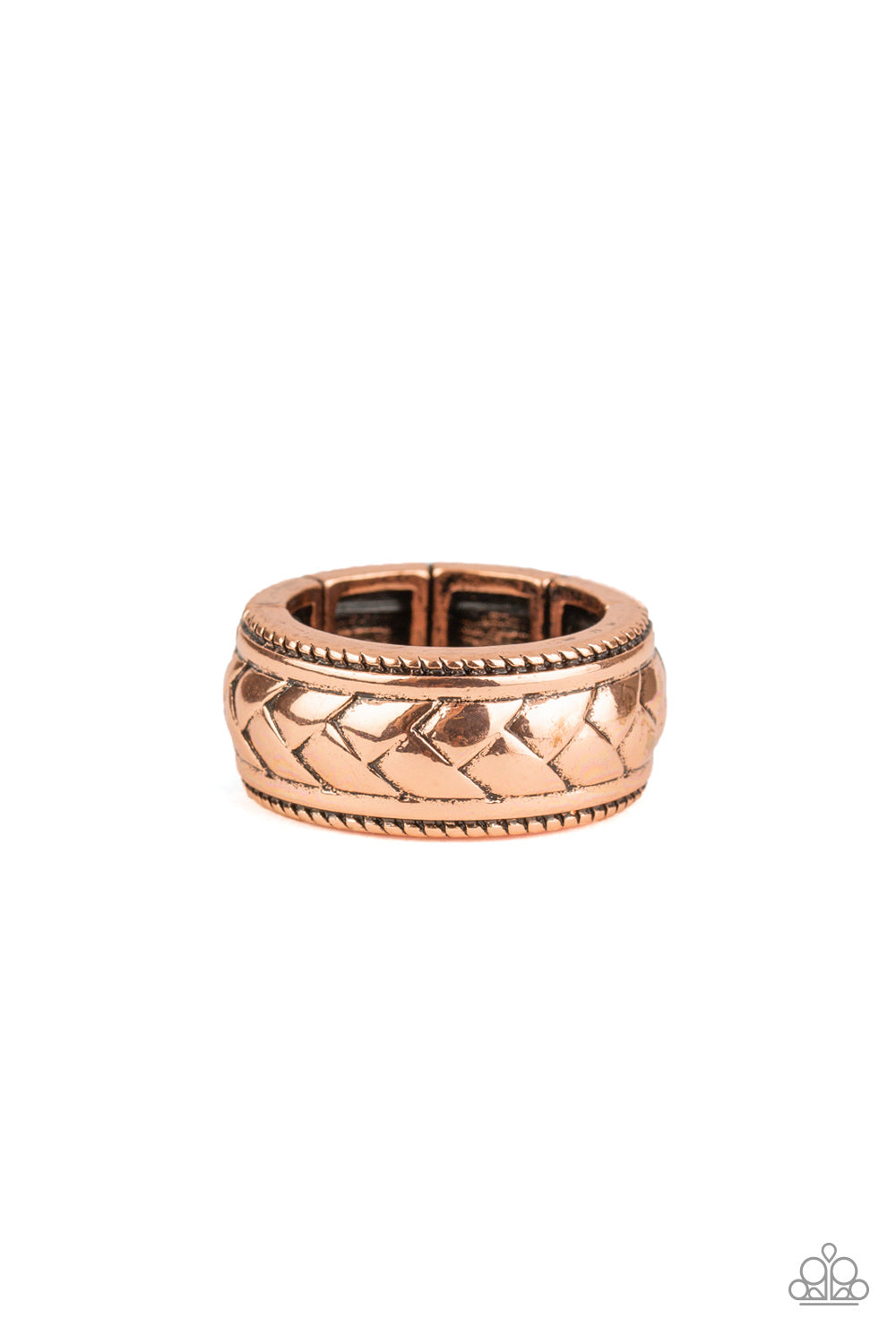 Brushed in an antiqued finish, a chevron-like pattern is embossed across the center of a textured copper band for a casual look. Features a stretchy band for a flexible fit.