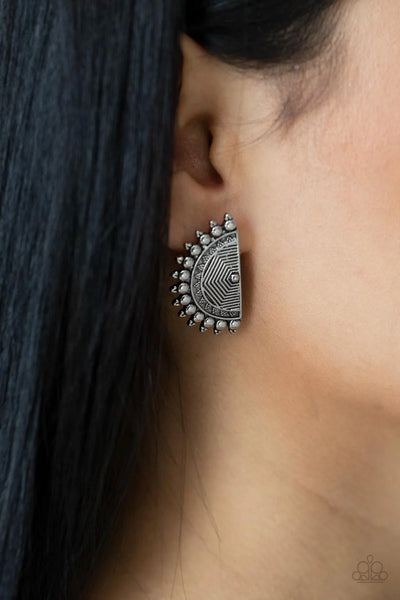 Tipped with triangular accents, flat brass studs fan out from the edge of a half moon frame embossed in antiqued linear texture, creating a bold tribal inspired display. Earring attaches to a standard post fitting.
