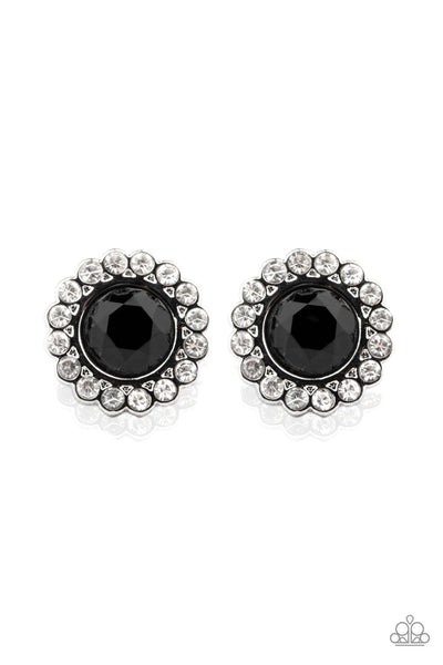 A glittery ring of dainty white rhinestones spins around a black rhinestone center, creating a sparkling floral frame. Earring attaches to a standard post fitting.