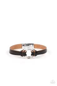 Silver leather strips knot around a soldered pair of asymmetrical hoops, knotting the rustic frame in place at the center of the wrist for a free-spirited finish. Features a magnetic closure.