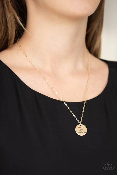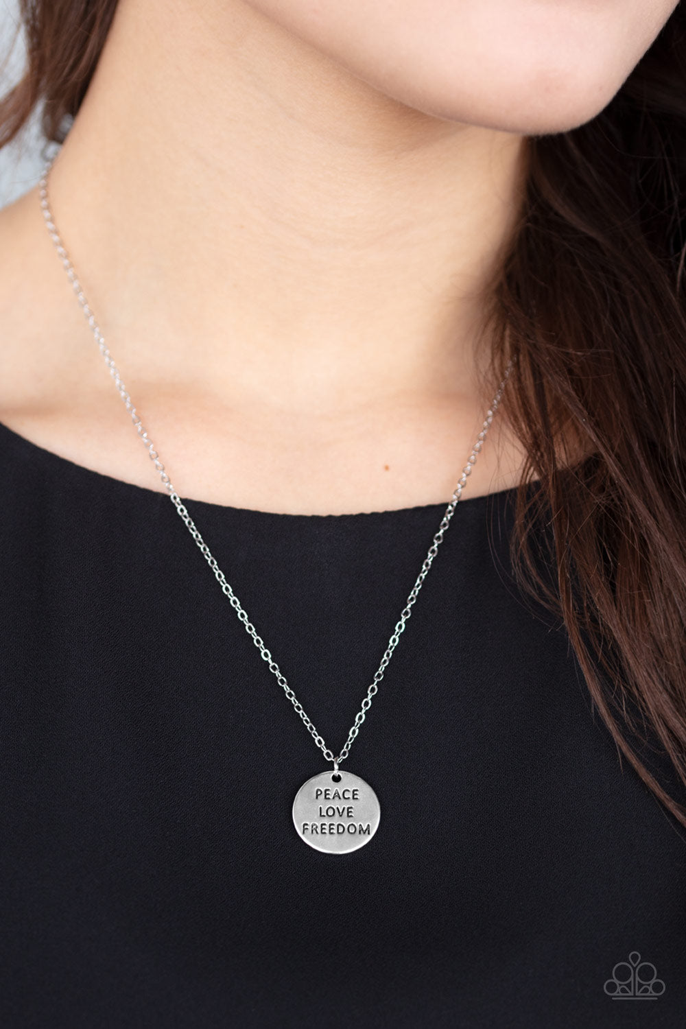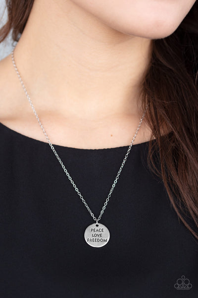 Stamped in the words, "Peace," "Love," and "Freedom," a shiny silver disc slides along a dainty silver chain below the collar for a patriotic inspired fashion. Features an adjustable clasp closure.
