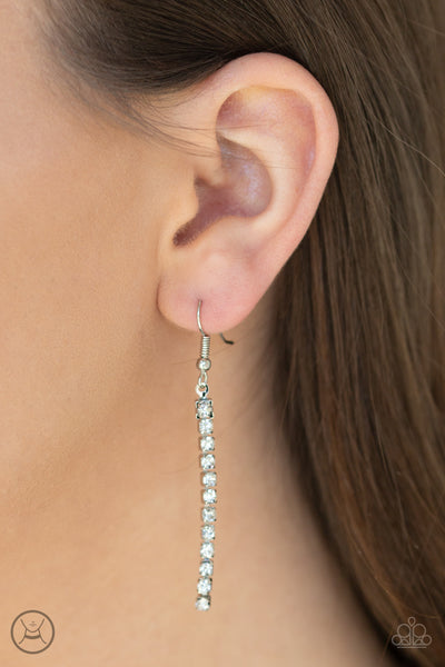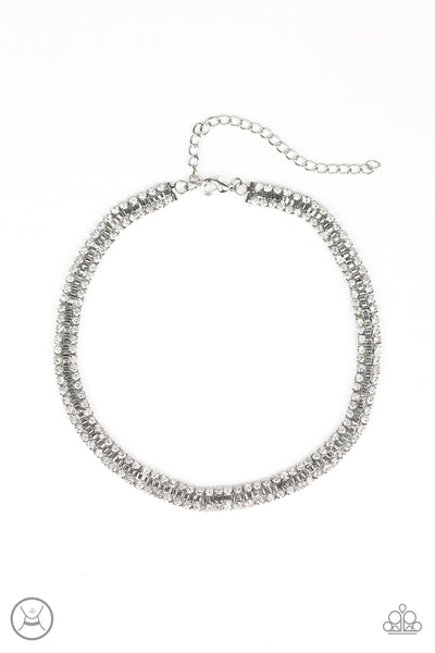Two strands of glittery white rhinestones flank one row of shimmery silver box chain, creating a glamorous flair around the neck.