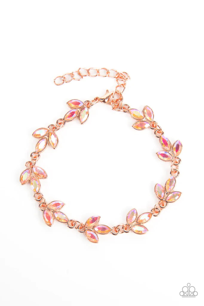 Twinkling trios of marquise cut iridescent rhinestones gather into leafy shiny copper frames as they delicately link around the wrist, resulting in a radiant centerpiece. Features an adjustable clasp closure.