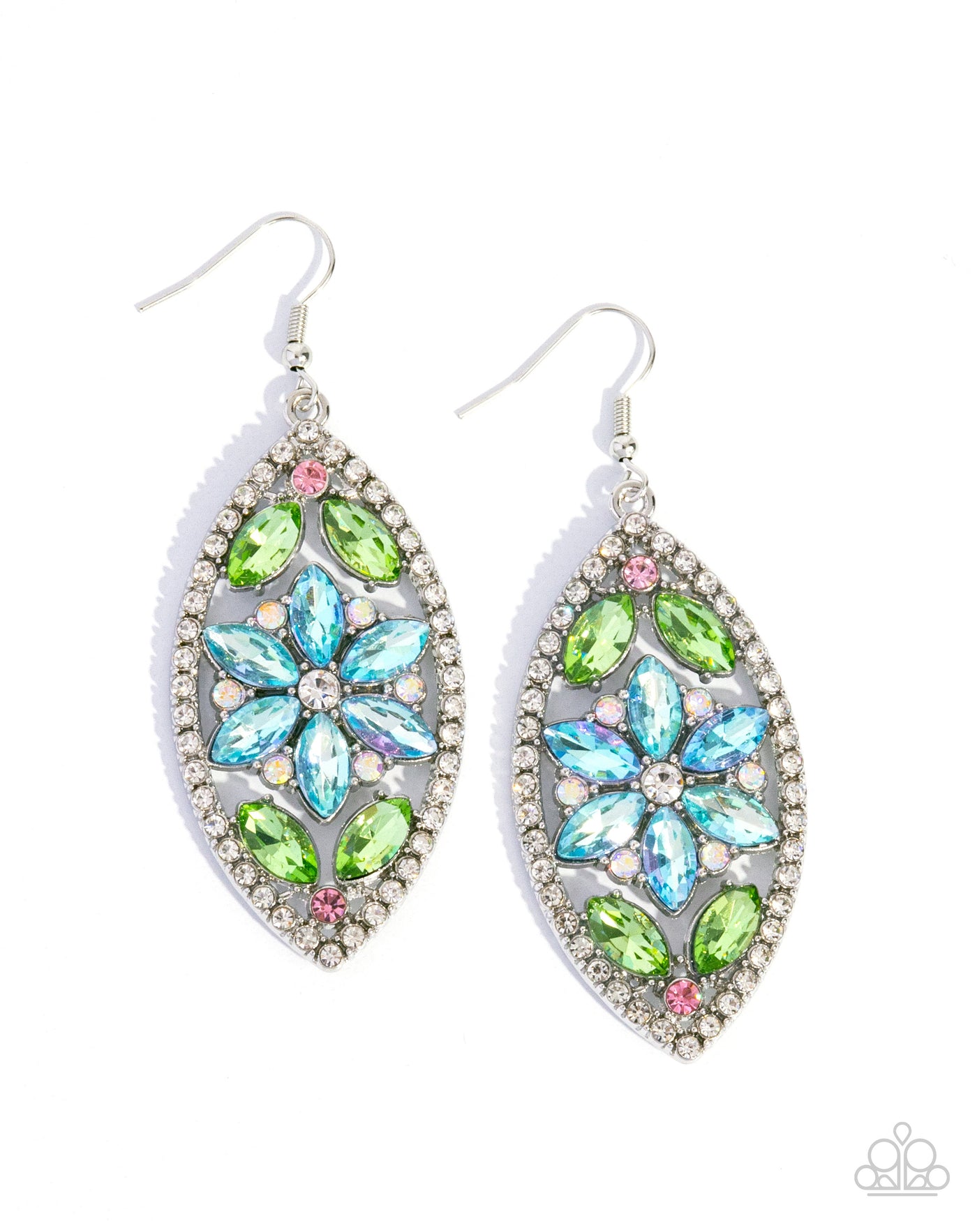 Pronged along the inner surface of an airy silver teardrop, a collection of green marquise-cut gem leaves bloom from solitaire light rose rhinestones while a white rhinestone-centered blue marquise-cut gem flower is featured in the center. Iridescent rhinestones frame around the blue flower for a touch of eye-catching radiance while the teardrop frame itself is bordered in white rhinestones for a sparkly finish. Earring attaches to a standard fishhook fitting. Due to its prismatic palette, color may vary.