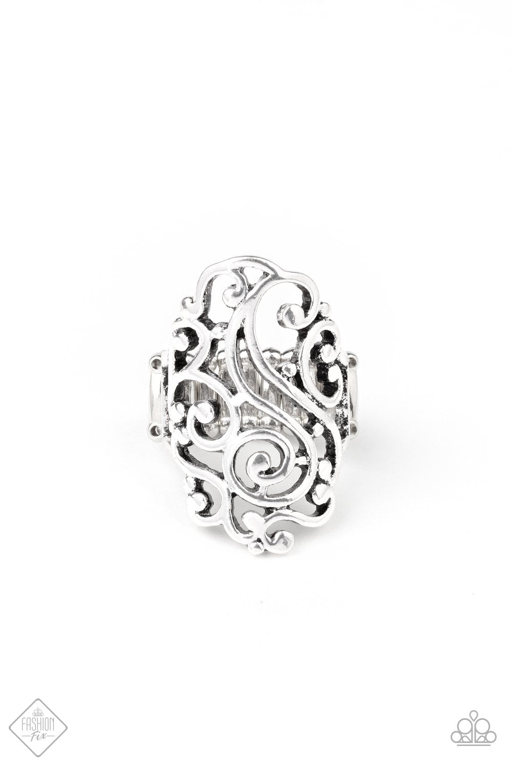 Shiny silver vine-like filigree climbs the finger, swirling into a seasonal frame. Features a stretchy band for a flexible fit.