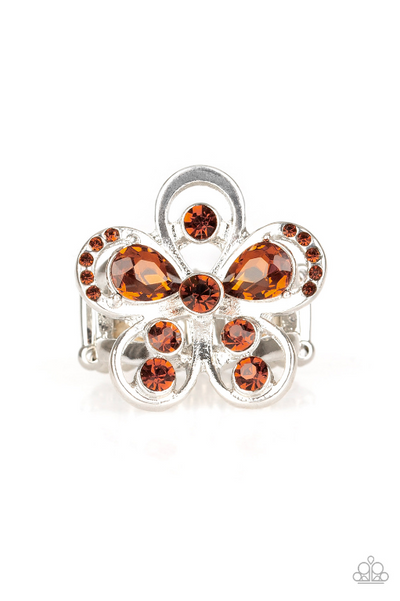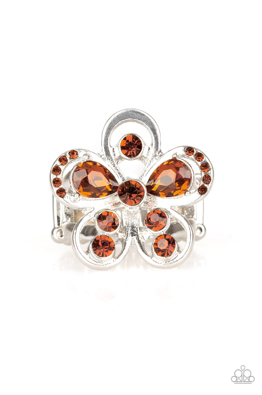 Varying in shape and size, fiery red rhinestones are sprinkled along airy silver petals, coalescing into a glittery flower atop the finger. Features a stretchy band for a flexible fit.