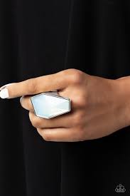A whimsical oversized opalescent bead featuring sharp geometric angles is pressed into a sleek, thick gold frame for a light-reflecting centerpiece atop the finger. Features a stretchy band for a flexible fit.