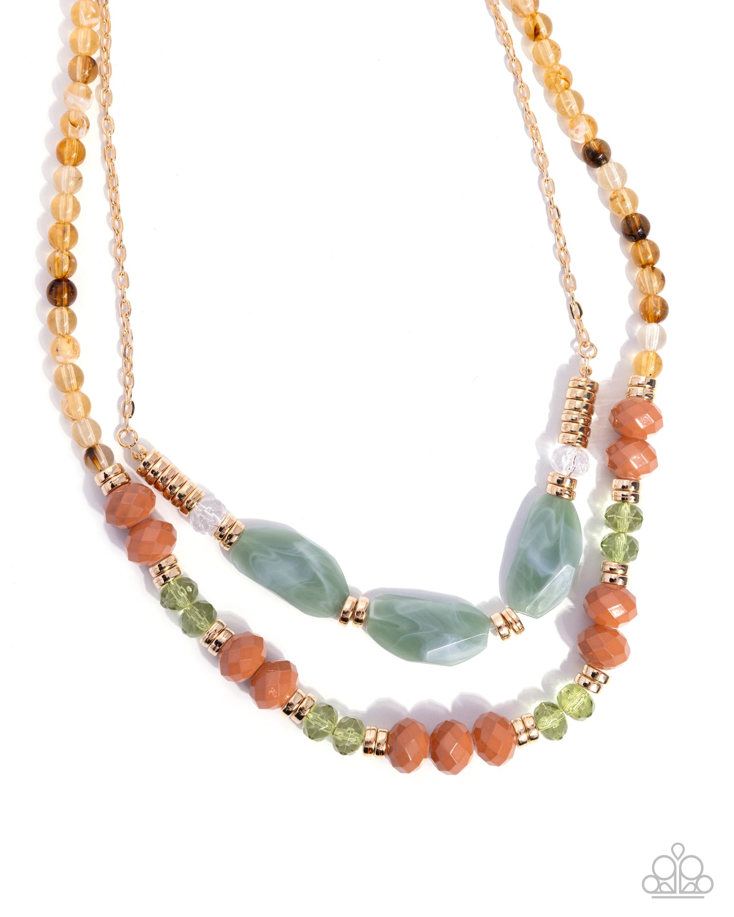 A variety of beads—some polished, some faceted, in jade, painted coral, translucent light green, and swirled brown—layer below the collar for an earthy, dimensional display. The large jade beads feature white marbling, while translucent beads add a subtle sparkle. Clusters of shimmery gold discs separate each bead, creating a refined pop of metallic sheen. Features an adjustable clasp closure.