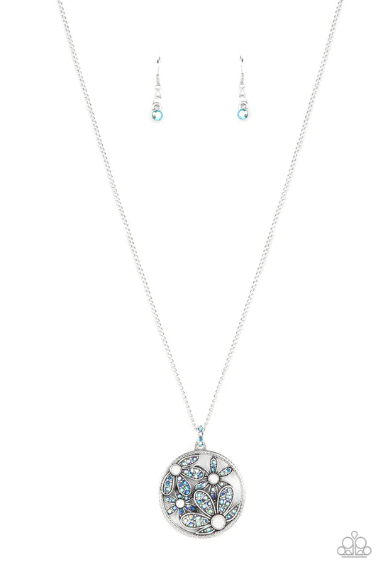 Dotted with opal white rhinestone centers, a clustered bouquet of iridescent blue rhinestone petaled flowers bloom inside a textured silver hoop, coalescing into an enchanting floral pendant at the bottom of an extended silver frame. Features an adjustable clasp closure.
