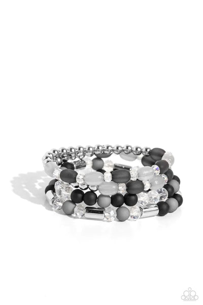 A shimmery collection of silver beads and accents, glassy long orange and yellow beads, faceted clear beads, and yellow and turquoise acrylic beads are threaded along stretchy bands around the wrist, creating glistening layers.