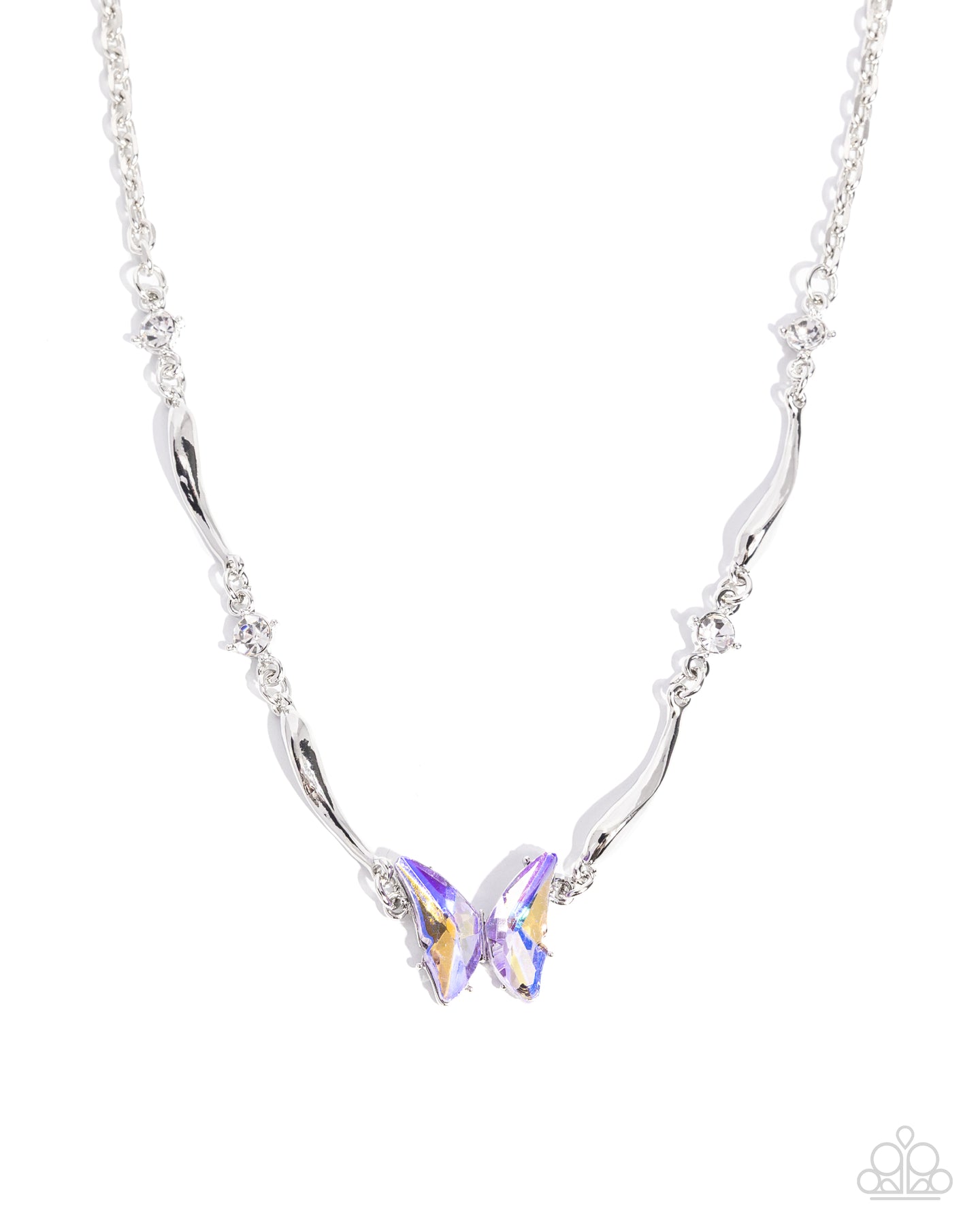 Connecting to a silver cable chain, a collection of pronged white rhinestones and curly silver bars alternate below the neckline leading the eye to an orange UV-shimmery butterfly for a whimsical pop of color and shimmer. Features an adjustable clasp closure.
