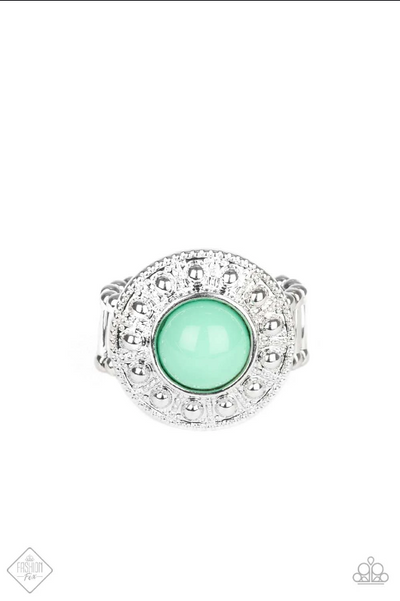 Ring: "Treasure Chest Shimmer" (P4WH-GRXX-156TC)- A shiny Biscay Green bead dots the center of a studded silver frame, adding a refreshing pop of color to any outfit. Features a stretchy band for a flexible fit.