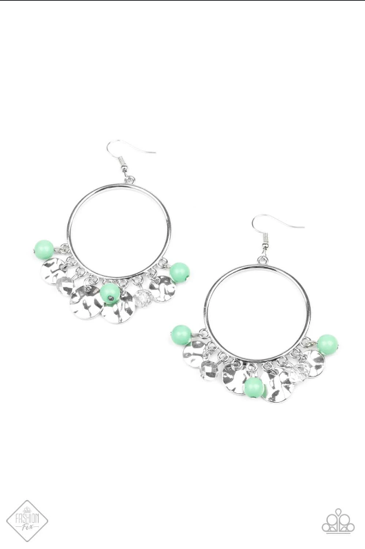 Earring: "Chroma Chimes" (P5RE-GRXX-137TC)- A shimmery collection of hammered silver discs, green crystals, polished Biscay Green beads, and metal flecked crystal-like teardrops dangle from the bottom of a dainty silver hoop, creating a whimsical fringe. Earring attaches to a standard fishhook fitting.
