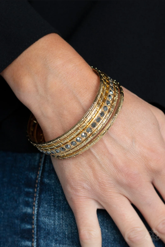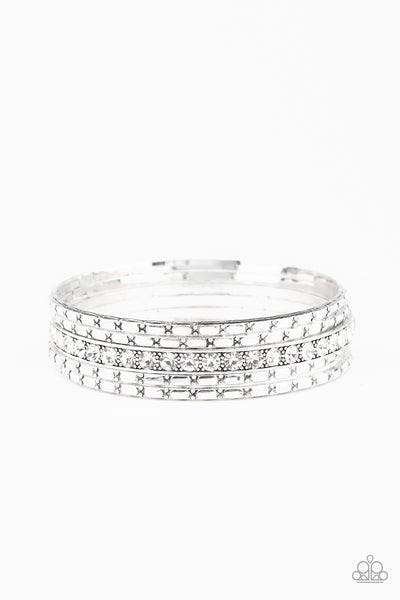 A single white rhinestone encrusted bangle joins four textured silver bangles, creating an edgy stack of shimmer across the wrist.