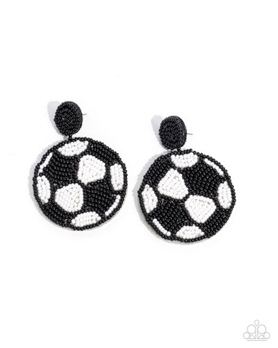 A black seed bead-embellished black felt post gives way to a soccer-like pendant formed from white and black seed beads for a sporty sensation. Earring attaches to a standard post fitting.