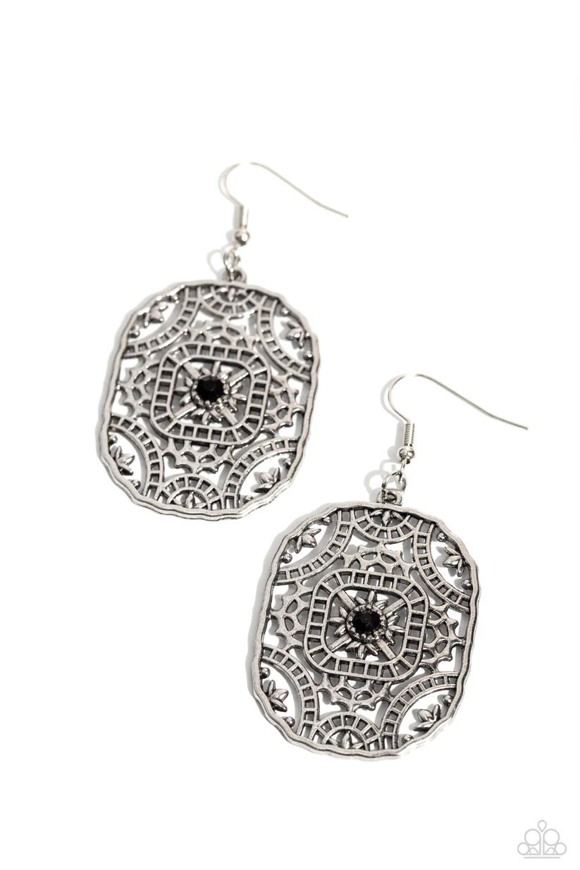Dotted with a glittery black rhinestone center, a floral filigree textile motif blooms inside a daintily scalloped silver frame for a seasonal pop of color. Earring attaches to a standard fishhook fitting.
