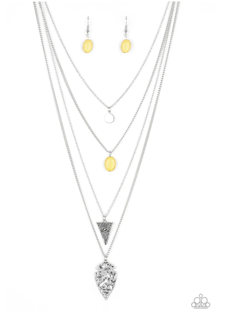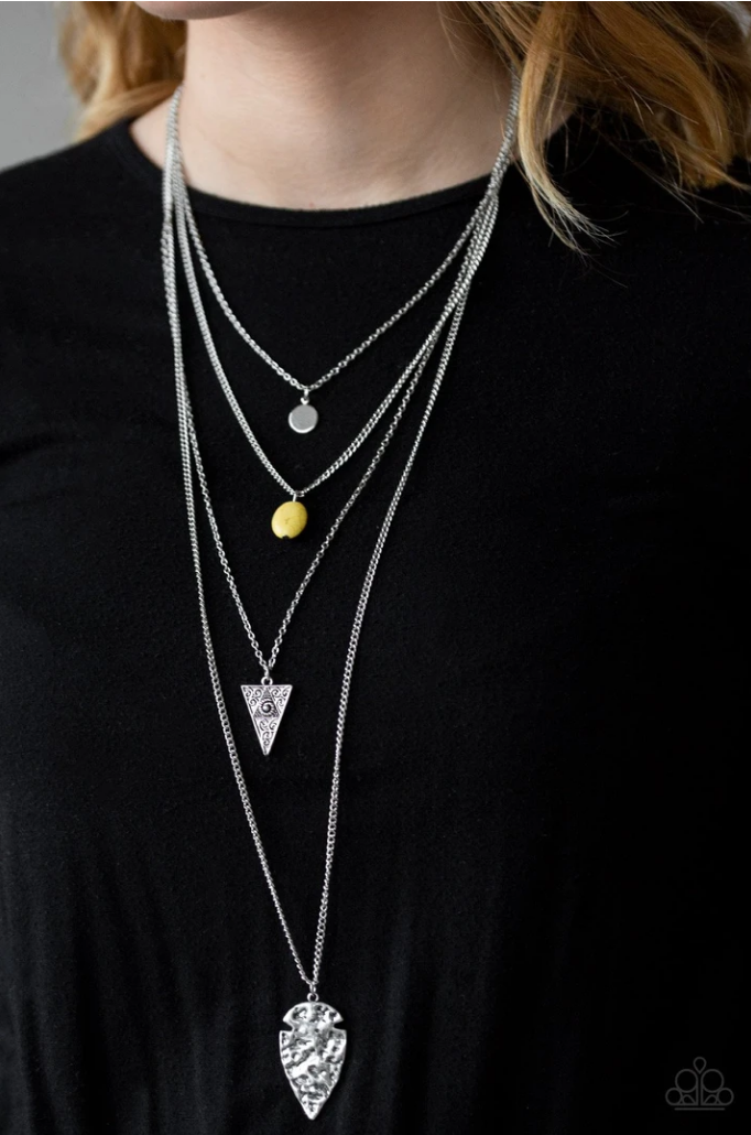 Glistening silver chains drape across the chest, creating four shimmery layers. A dainty silver disc swings from the uppermost layer above a sunny yellow stone, ornate triangular frame, and hammered silver arrowhead pendant for an artisan inspired look. Features an adjustable clasp closure.