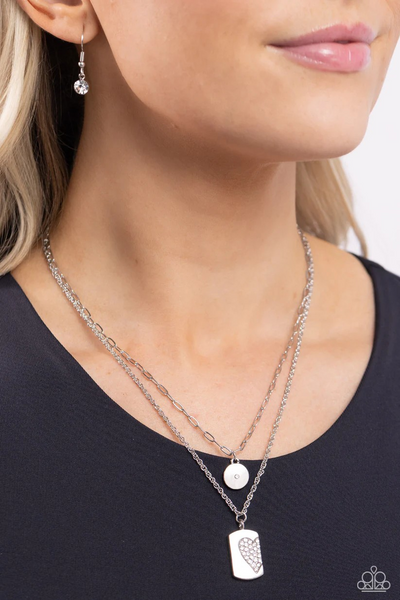 Dotted with a single white rhinestone, a shiny silver disc glistens at the bottom of a dainty silver link chain. Featuring a white rhinestone-embossed half-heart motif, a rectangular silver pendant glides along a dainty classic silver chain, resulting in subtly romantic layers below the collar. Features an adjustable clasp closure.
