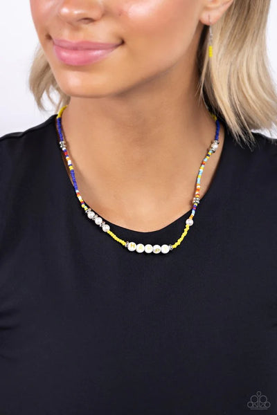 Infused along an invisible string, white pearls, multicolored seed beads, silver accents, and white beads spelling out the word "HAPPY" in yellow lettering wrap around the neckline for an optimistic, youthful display. Features an adjustable clasp closure.