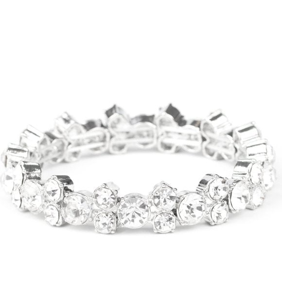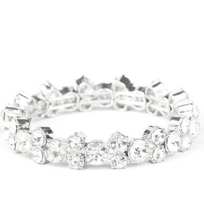 Featuring sleek silver frames, trios of glittery white rhinestones are threaded along stretchy bands around the wrist for a timeless shimmer.